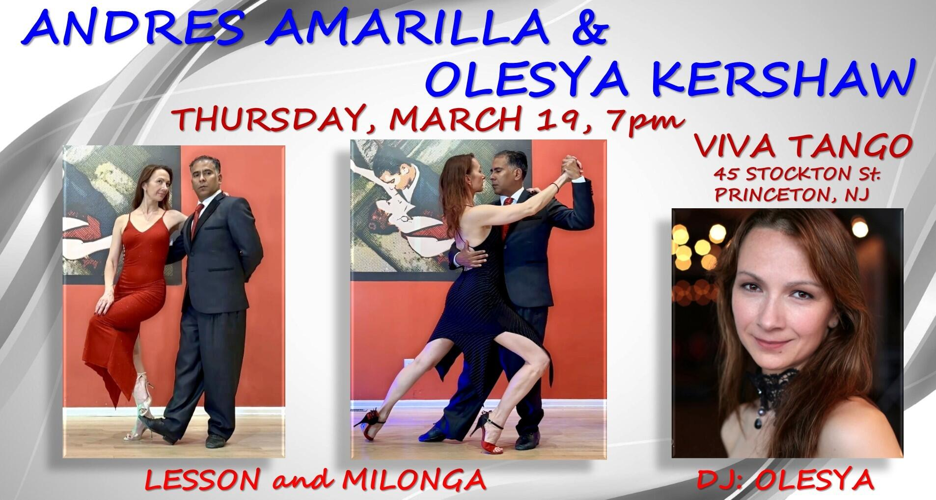 Thursday, February 19th. Andres Amarilla & Olesya Kershaw will be guest instructors and will teach a lesson. Olesya started dancing in Kiev, Ukraine, in 2011, and has been attending tango festivals and milongas around the world since then. She joined tango community in Philadelphia last year, and has greatly enriched it by her presence. She is known for her beautiful adornments, exceptional musicality and elegant lines.