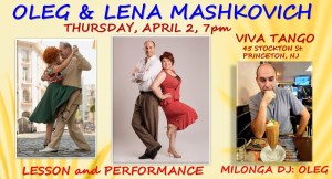 Thursday, April 2nd. Oleg and Lena Mashkovich are well known in Buenos Aires and in USA as experienced (23+ years) Argentine Tango dancers, teachers, performers, and DJ. They teach Tango with respect to the authentic roots of this unique culture, following old tradition, and exploring new technique and flavors, combining them and giving the resulting style their own personality. Oleg and Lena participated in the prestigious Argentine Tango competitions, always becoming finalists. Oleg will be the DJ. He has the passion and enthusiasm to deliver unforgettable tango dancing experience.