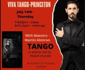 July 14th Martin Almiron and MayoK are at VivaTango Princeton. This is Martin’s first visit to Princeton. Martin was a finalist in both Salon Tango and Stage Tango categories at the World Tango Dance Championship, and also a finalist in the Salon Tango, Milonga and Walts categories at the Metropolitan Tango Dance Championship. He has danced in the best national and foreign theaters such as New York City Center, John F. Kennedy Center for the Performing Arts, Théâtre du Châtelet of Paris, Presidente Alvear Theater, Cervantes National Theater in Buenos Aires, National Theatre of Panama, Ruben Dario National Theatre of Nicaragua, among others; and worked with renowned choreographers, building a great career with his performances in the prestigious plays like “Evita” on Broadway, “Chantecler”, “Azares del Quijote y Gardel”, “Evitango” and “Evita Vive”. Martin will be available for taxi dancing during the milonga on Thursday. MayoK aka Urszula has traveled the world in search of tango adventure. She has organized several Havana Tango Marathons in Cuba. MayoK chooses and plays music like she is conducting a live orchestra to match the beating hearts of the dancers. Her music evokes deep emotions. Join her for “The Beating Heart Milonga”. Lesson starts at 7 PM and milonga at 8:15. Lesson $15, Milonga $15 or both $20. EVENT LINK