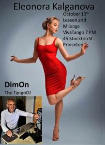 This Thursday the wonderful Eleonora Kalganova will be at VivaTango to share her Tango skills with you. Being in the smack middle of the New York City to Philadelphia area we are lucky to be surrounded by many Tango stars. Eleonora stands out from this collection. She is a spark of energy and lights up the dance floor with her whimsical personality. Her dancing is spontaneous and creative. Her foot work is absolutely amazing. I fail to find enough adjectives to fully praise what she brings to the dance floor. Come Thursday and see for yourself. If you ever need a lift to your day just go to Eleonora’s YouTube channel CHANNEL and watch one of her 204 videos. Eleonora will teach a lesson and host the milonga that follows this Thursday. DimOn (aka Dmitri) the Tango DJ will be playing tandas that you will love to dance to. He brinks his own spark of energy to the selection of tandas and is very popular at VivaTango and other milonga venues. He will keep you dancing until the call of “Last Tanda”.