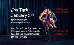 January 5th Jon Tariq will host a Milonga. Jon’s talents span the entire spectrum of Argentine Tango skills. Argentine Tango Instructor, Performer, Choreographer, DJ and more. Jon is one of the most sought-after instructors in NYC. Jon’s progressive and fun approach to teaching inspires students of all levels. His mission is to pass on the in-depth knowledge he has acquired from his many great teachers, contribute to the growth of the tango community and help preserve the traditions of Argentine Tango. Jon will teach Milonguero Ocho Cotado with Sacadas and include tips for Embellishments for the followers. 7:00 Lesson, 8:15 Milonga. Lesson $15, Milonga $15, Both $20