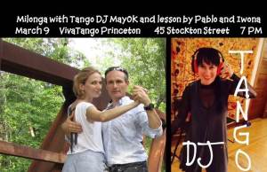 Thursday March 9th Milonga will feature Pablo Garcia Gomez & Iwona Ionescu who will teach a lesson titled “The dynamic embrace as a source of expression for simple and complex tango movements.” Pablo and Iwona are the instructors for the Princeton Adult School Tango classes, and are popular instructors at VivaTango and other tango events. The Milonga will feature DJ MayoK (aka Urszula) the world traveling DJ who is back in the United States again.All levels lesson starts at 7:00, Milonga at 8:15. Lesson $15, Milonga $15, Both $20. EVENT LINIK
