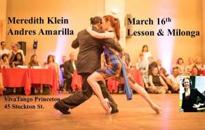 Thursday March 16th Meredith Klein and Andres Amarilla will host the milonga preceded by a lesson at 7 PM and followed by the milonga at 8:15. Lesson topic is “Interesting Possibilities from the 3rd of the Basic” Meredith andAndres organize the many Tango events offered by the Philadelphia Argentine Tango School, and are internationally known tango dancers. Lesson $15, Milonga $15 or Both $20.