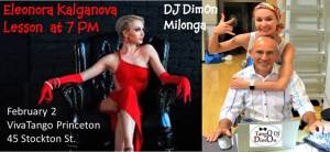 Thursday March 30th Eleonora Kalganova and DJ DimOn will host a milonga. Eleonora is an accomplished instructor and a spontaneous dancer who has danced all over the world. She will teach an all-levels class at 7 PM. DimOn the Tango DJ will play tandas for your dancing pleasure that feed your tango feeling. Lesson 7:00, Milonga 8:15. Lesson $15, Milonga $15, Both $20.