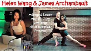 May 4th Helen Wang and James Archambault return to VivaTango to host the milonga. They will teach an all-levels lesson at 7 PM on “Vals Sequences and Musicality”. Helen is a popular Tango Instructor in NYC and host of the Candlelight Milonga. The Milonga will follow the lesson at 8:15. Lesson $15, Milonga $15 or Both $20.