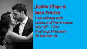 Thursday May 18th Jackie Ericson Pham and Sean Ericson Sean and Jackie love sharing their infectious joy and enthusiasm for tango! Sean won the ATUSA Stage Tango category and represented the US at the Tango Mundial world championships. Jackie’s passion is for fluid co-creation across all styles of tango. She was a regular DJ at DC’s most popular milongas as well as regional marathons and festivals. Jackie and Sean are the current instructors for the Princeton Tango Club. Lesson starts at 7:00. The Milonga will follow the lesson at 8:15. They will perform at 9:30. Lesson $15, Milonga $15 or Both $20. EVENT LINK