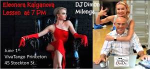 Thursday June 1st Eleonora Kalganova and DimOn the TangoDJ will host a milonga. An all-levels class taught by Eleonora will precede the milonga. DimOn will play great tandas for your dancing pleasure.Lesson 7:00, Milonga 8:15. Lesson $15, Milonga $15, Both $20.