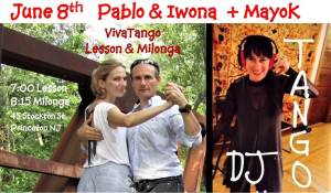 Thursday June 8th Pablo Garcia Gomez & Iwona Ionescu who will teach a lesson. Pablo and Iwona are the instructors for the Princeton Adult School Tango classes, and they are popular instructors at VivaTango and other tango events. MayoK the TangoDJ will play for the Milonga that will follow the lesson. All levels lesson starts at 7:00, Milonga at 8:15. Lesson $15, Milonga $15, Both $20.