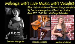 Thursday June 29th will feature a Milonga with Live Music, Plus a special showing of historic videos of famous Tango Vocalists. Doctora Margarita, video DJ extraordinaire, will make her third appearance at VivaTango. She will bring her collection of historic videos and movies and knowledge of the lives of famous Tango musicians and their music. This week she will focus on vocalists. You will have the opportunity to dance to videos of historic vocalists. Then Claudio Morsella will play live music for your dancing pleasure. He will be accompanied by vocalist Melissa Wrolstad. Their last performance at VivaTango was a great success. During the milonga Doctora Margarita will play wonderful tandas, between the sets of live music, that capture the smoothness and emotion of Tango. Milonga starts at 7 PM. Cost $20.