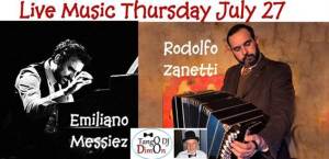 Thursday July 27 Live music by Emiliano Messiez and Rodolfo Zanetti. Emiliano was the pianist for the Broadway and London show “Forever Tango”, a show that has been seen by more than 8 million people around the world. He has also served as the music director and pianist for the successful shows “Impact” and “Tango Buenos Aires”, and he is the creator of “Barolo Tango,” a live tango show based in Argentina. Rodolfo, a native of Argentina, plays the bandoneon. Rodolfo directed Maria de Buenos Aires, the masterpiece of Astor Piazzolla and Horacio Ferrer in 2003. In the United States, Zanetti has performed as soloist at the Kennedy Center for the Performing Arts, the Embassy of Argentina, Lincoln Center for the Performing Arts and Carnegie Hall. In 2017 he won the First Prize as a bandoneonist at the “Che Bandoneón International Competition” awarded by the Argentine Tango Society. In 2018 he played the bandoneon on the album “Vigor Tanguero” by Pedro Giraudo, which won the Latin Grammy for the best Tango Album. DimOn (aka Dmitri) will DJ between live music sets. Cost $20. EVENT LINK