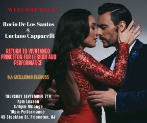 Thursday September 7th will feature Luciano Capparelli and Rocío de los Santos, stars of the Tango Fire traveling Tango Show. The New York Times review of the TANGO FIRE performance in NYC said “No couple, however, was as beautifully lavish as Luciano Capparelli and Rocío de los Santos. In each of their tangos, tension gave way to voluptuous softness and powerful overhead lifts melted onto the floor in silken extensions. As the title goes, they were on fire.” DJ Guillermo Elkouss returns to VivaTango. He was an instructor and DJ at the beginning of VivaTango 12 years ago. All levels lesson 7:00, Milonga 8:15, Performance 9:30. Lesson $15, Milonga $15, Both $20.