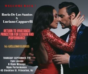 Thursday September 7th will feature Luciano Capparelli and Rocío de los Santos, stars of the international Tango Fire traveling Tango Show. The New York Times review of the TANGO FIRE performance in NYC said “No couple, however, was as beautifully lavish as Luciano Capparelli and Rocío de los Santos. In each of their tangos, tension gave way to voluptuous softness and powerful overhead lifts melted onto the floor in silken extensions. As the title goes, they were on fire.” Between 2006 and 2013, they taught and danced all around the world, traveling with and performing at the “Tango Buenos Aires” show. Their last performance at VivaTango was 5 years ago: VIDEO. The Guest DJ for this week is Guillermo Elkouss who was an instructor and DJ at the beginning of VivaTango 12 years ago. We welcome Guillermo and his wife Vittoria back to VivaTango. All levels lesson 7:00, Milonga 8:15, Performance 9:30. Lesson $15, Milonga $15, Both $20. EVENT LINK