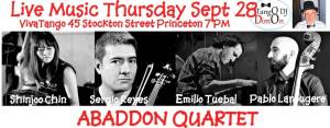 Thursday September 28th The Abaddon Quartet will fill the dance floor with live music. This quartet explores the vast repertoire of vibrant and passionate music from Buenos Aires, infusing it with new vitality while respecting the essence of its traditions. Shinjoo Cho, bandoneon; Sergio Reyes, violin; Emilio Teubal, piano; and Pablo Lanouguere, double bass. DJ DimOn will be playing your favorite tandas during the breaks. Milonga starts at 7 PM with DJ. Live music starts at 8:30. $20EVENT LINK