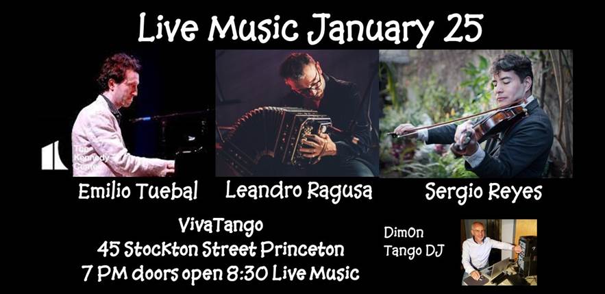 Thursday January 25th will feature live music by a special trio including Emilio Teubal, pianist for many Tango groups in NYC; David Hodges, bandoneonist, and Sergio Reyes, violinist. These extraordinary musicians will play for your dancing pleasure at VivaTango. DimOn the Tango DJ will fill the breaks with tandas for your dancing pleasure. Milonga begins at 7 PM with DJ DimOn, Live Music starts at 8:30. $20 EVENT LINK