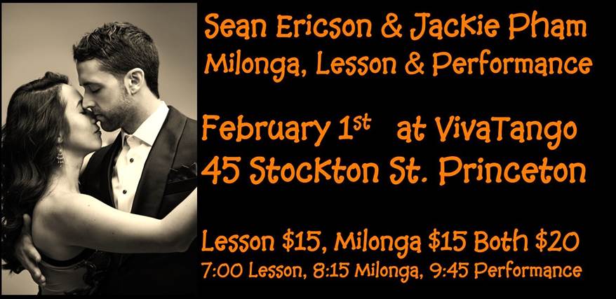 Thursday February 1st will feature Sean Ericson and Jackie Pham. Sean and Jackie love sharing their infectious joy and enthusiasm for tango! Sean won the ATUSA Stage Tango category and represented the US at the Tango Mundial world championships. Jackie’s passion is for fluid co-creation across all styles of tango. She was a regular DJ at DC’s most popular milongas as well as regional marathons and festivals. She will DJ for your dancing pleasure. Jackie and Sean are the current instructors for the Princeton Tango Club. Lesson starts at 7:00. The Milonga will follow the lesson at 8:15 and the performance will be at 9:45. Lesson $15, Milonga $15 or Both $20 EVENT LINK
