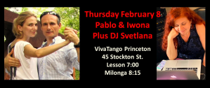 will feature a lesson by Pablo Garcia Gomez & Iwona Ionescu and a Milonga hosted by Svetlana Howells. Pablo and Iwona are the instructors for the Princeton Adult School Tango classes, and they are popular instructors at VivaTango and other tango events. Their lesson this week will be “Conventional and unconventional crosses”. After the lesson Pablo and Iwona will be available at the side of the dance floor to help any dancers wishing more help with the lesson. Svetlana Howels will DJ the milonga and play well composed tandas for your dancing pleasure. Lesson at 7 PM, Milonga at 8:15. Lesson $15 Milonga $15, Both $20.