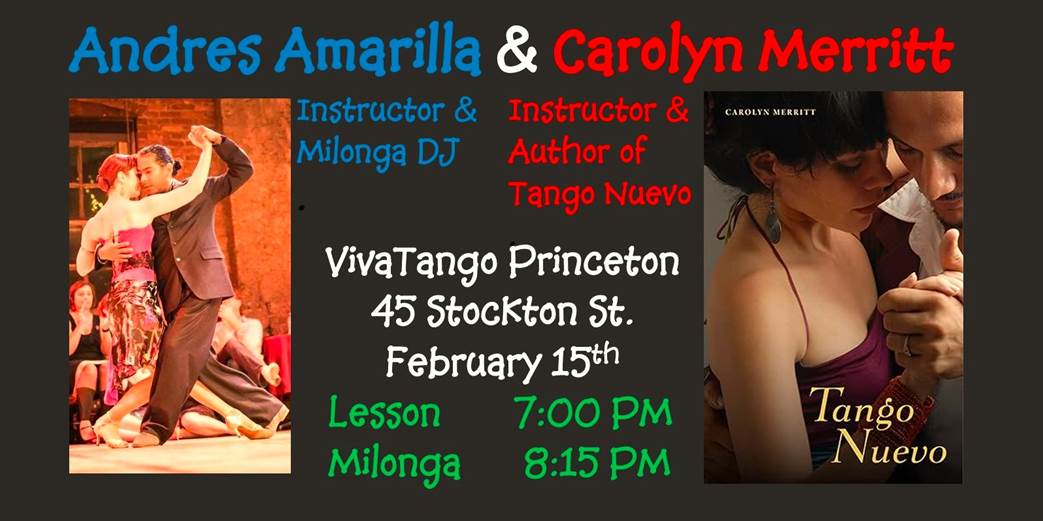 will feature Andres Amarilla and Carolyn Merritt. Andres Amarilla is on tour from Buenos Aires and returns to VivaTango. Carolyn is the author of the book Tango Nuevo. Ignacio who is a popular DJ in Buenos Aires will DJ for you at this event. Lesson at 7 PM, Milonga at 8:15. Lesson $15 Milonga $15, Both $20