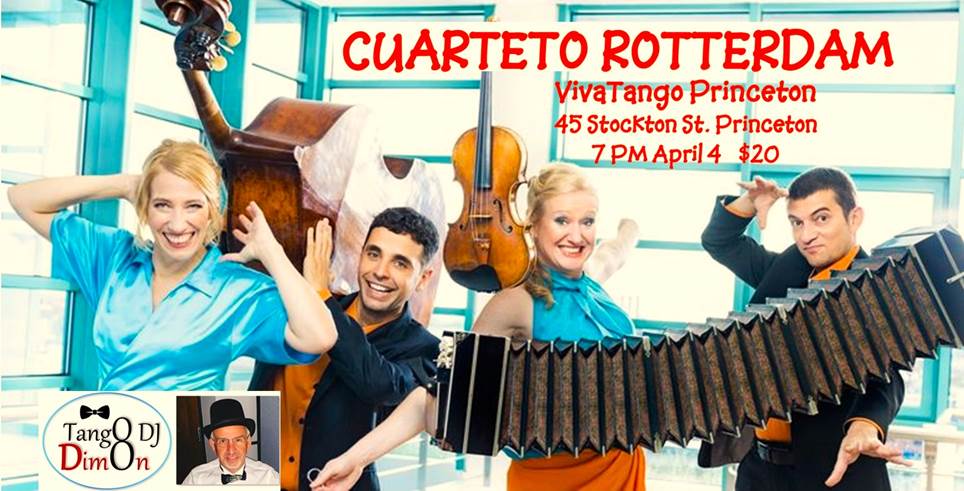 Thursday April 4th will feature Live Music by the Cuarteto Rotterdam Quartet. This quartet is regarded as one of the best Tango ensembles in Europe. This quartet is tango–full of passion, virtuosity and power. They perform the early and more cheerful kind of tango music from the Guardia Vieja era with such ease that it makes everyone want to dance, and they present the Golden Age of tango from the 1940s with the highlights of the grand orchestras a la Di Sarli, Troilo, D’Arienzo, Pugliese or Salgán. They also include the tango of the contemporary Argentine and European tango pieces in their performances. They are know for connecting their music to the dancers. The quartet’s classic structure, consisting of bandoneón, violin, piano, and double bass, provides a sound experience ranging between tradition and modernity. With their creativity, imagination, and experience, this small orchestra conjures up a world of tango for all kinds of emotions. Come dance to their music. Filling in between live sets will be DJ DimOn with skill of picking tandas and lively cortinas. Doors open at 7 PM with DimOn music. Live music starts at 8:30. $20. EVENT LINK