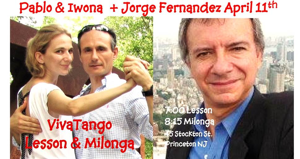 Thursday April 11 will feature a milonga hosted by Jorge Fernandez and a lesson by Pablo Garcia Gomez & Iwona Ionescu. Pablo and Iwona are the instructors for the Princeton Adult School Tango classes, and they are popular instructors at VivaTango and other tango events. Their lesson this week will be “Embellished milonga turns”. After the lesson Pablo and Iwona will be available at the side of the dance floor to help any dancers wishing more help with the lesson. Jorge Fernandez will DJ the milonga. He is a guest DJ from NYC who comes with to us by popular demand. Come dance to his tandas. Lesson at 7 PM, Milonga at 8:15. Lesson $15 Milonga $15, Both $20. EVENT LINK