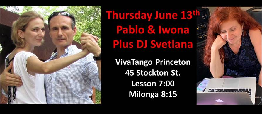 Thursday June 13th will feature a lesson by Pablo Garcia Gomez & Iwona Ionescu and a Milonga and a Milonga hosted by Svetlana Howells. Pablo and Iwona are the instructors for the Princeton Adult School Tango classes, and they are popular instructors at VivaTango and other tango events. Their lesson this week will explore and practice jumps for tango, vals, and milonga. Jumps are not very often included in workshops and lessons so don’t miss this class! After the lesson Pablo and Iwona will be available at the side of the dance floor to help any dancers wishing more help with the lesson. Svetlana Howells will DJ the milonga and play well composed tandas and cortinas for your dancing pleasure. Lesson at 7 PM, Milonga at 8:15. Lesson $15 Milonga $15, Both $20.