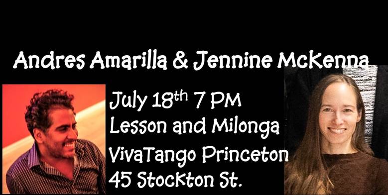 Thursday July 18th Andres Amarilla and Jennine McKenna will host the milonga and teach a lesson. Andres was born and raised in Buenos Aires. He studied with and performed in the dance companies of three of the greatest tangueros of all time: Gustavo Naveira, Juan Carlos Copes, and Rodolfo Dinzel. Andres will DJ for the milonga. Introducing Jennine McKenna. This is Jennine’s first appearance at VivaTango. Lesson at 7 PM, Milonga at 8:15. Lesson $15, Milonga $15, Both $20. EVENT LINK