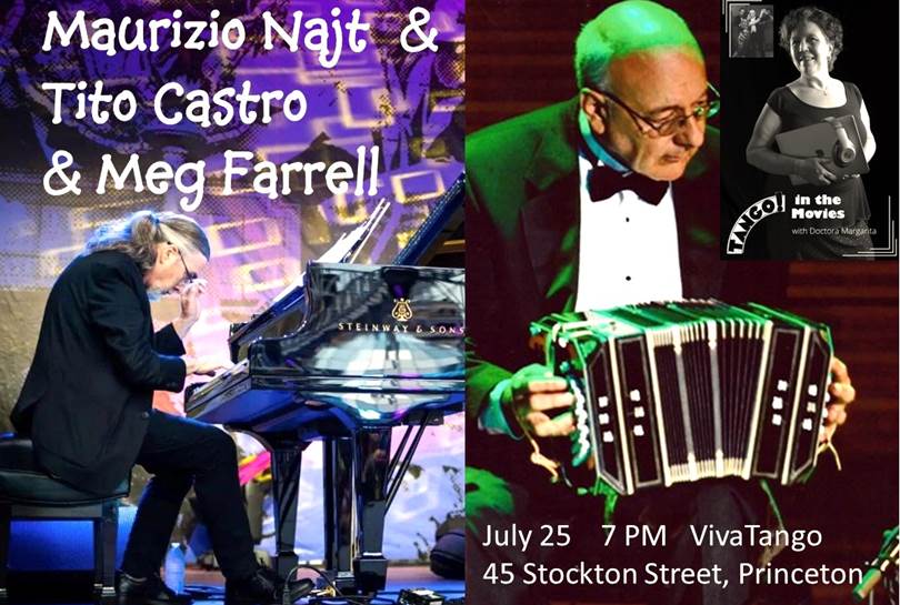 Thursday July 25th Maurizio Najt and Tito Castro will play live music. Maurizio is a graduate of the Conservatorio Nacional de Música in Buenos Aires. He performed with Amigos del Tango and Forever Tango Orchestras at venues such as Lincoln Center, Alice Tully Hall, Winter Garden, and the Argentine Embassy in Washington DC and Tokyo. Tito is a legend in the Tango Community. Bandoneon player, director, composer and arranger. He is a product of the Buenos Aires Tango community and now lives in New York. He has toured the world performing in many famous venues. In addition he performed in the movie ”Flawless” starring Robert de Niro, Carnegie Hall, the Metropolitan Opera, and the Ballet Theater NY City. Meg Farrell will DJ between live sets and project videos that embrace the era of the music. DJ music and videos start at 7 PM. Live Music starts at 8:30. $20. EVENT LINK