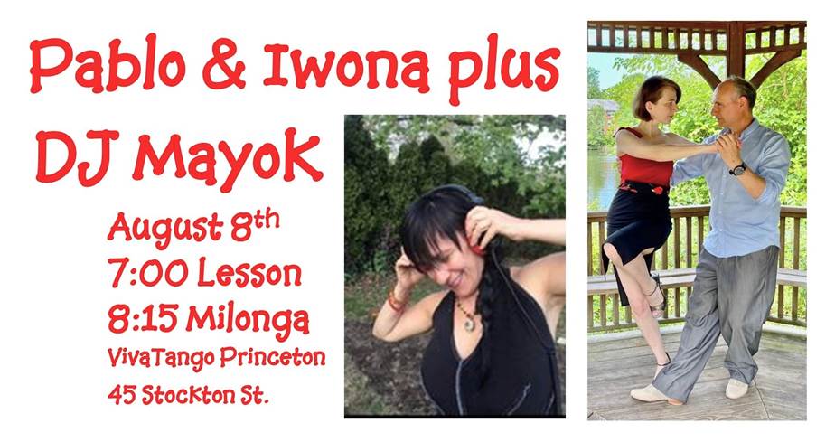 Thursday August 8th will feature a lesson by Pablo Garcia Gomez & Iwona Ionescu and a Milonga hosted by MayoK (aka Urszula Abolik). Pablo and Iwona are the instructors for the Princeton Adult School Tango classes, and they are popular instructors at VivaTango and other tango events. They will teach an all-levels lesson. After the lesson Pablo and Iwona will be available at the side of the dance floor during the milonga to help any dancers wishing more help with the lesson. DJ MayoK will host the milonga and play well composed tandas and cortinas for your dancing pleasure. Lesson at 7 PM, Milonga at 8:15. Lesson $15 Milonga $15, Both $20.
