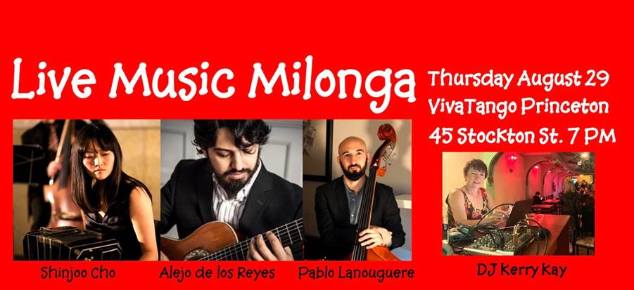 Thursday August 29th features live music by Shinjoo Cho, Alejo de los Reyes and Pablo Lanouguere. Alejo is one of the most highly regarded Tango guitarists in the world. He is on tour and VivaTango is please to host him for your dancing pleasure. He is joined by Shinjoo and Pablo – both extraordinary Tango musicians based here in the NYC and Philly area. Alejo is a third-generation Argentine guitarist trained by his father and grandfather. He has performed in many prestigious events around the world. He is also a composer and recording artist. Shinjoo (bandoneon) is a leader and member of Tango musical groups in the Philly and NYC area. Pablo (double-base) is also a well known Tango musician and frequent performer at VivaTango. These three musicians recently performed in NYC at the Lincoln Center, Summer for the City concert as part of the Abbadon Tango Group performance. Come see these amazing musicians in the intimate venue of the VivaTango dance floor. DJ Kerry Kay will be the host of this milonga. She will play Tangos for your dancing pleasure starting at 7 PM. Live music starts at 8:30. $20