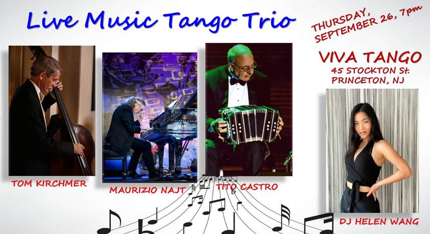 Thursday, September 26th will feature a trio of extraordinary musicians who will play “unplugged”, without microphones, for your dancing pleasure. Maurizio Najt is a well-known regular at Viva Tango and many other events. He played a leading role in the New York Tango revival scene during the late 90’s, performing with New York Tango Trio. He also was a member of Forever Tango Orchestra. Tito Castro is a bandoneon maestro, a living legend as a composer, arranger and performer, who’s been playing his bandoneon for six decades. He was born and lived in Buenos Aires where he started playing bandoneon at age 15. Tito has played at milongas of Buenos Aires during the Golden Age of Tango. Tom Kirchmer is a bassist extraordinaire. He began playing tango with Jorge Anders and Tito Castro in 2001 and recorded the album “Con Polenta” with that trio, named the “Buenos Aires Tango Trio”. He has played with Tito Castro ever since. He has performed on the sound track to Ang Lee’s 2007 film “Lust, Caution” and toured Japan with Anna Saeki playing tango with Tito Castro and Maurizio Najt. Between live music sets, our favorite DJ and performer Helen Wang will play her favorite tandas to keep us dancing.