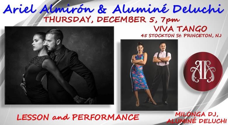 Thursday December 5th Aluminé Deluchi and Ariel Almirón are professional tango dancers, teachers, and finalists of the 2019 and 2021 Tango World Cup in tango stage and tango salon categories. They have also performed at many tango shows in Buenos Aires, such as Señor Tango, Café de los Angelitos, Tango Porteño, Palacio Tango, Rojo Tango, and others. They are currently on their USA Tour. Come and see their show in Princeton, and participate in a lesson from these esteemed instructors. Ariel is the brother of Martin Almirón who performed at Viva Tango in July 2022.