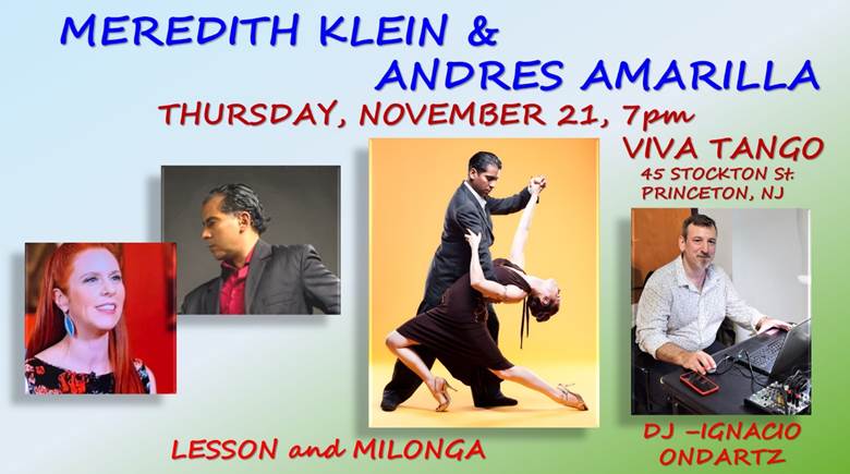 Thursday, November 21st. Meredith Klein and Andres Amarilla are frequent instructors and performers (together or individually) at Viva Tango. Meredith is the founder of Philadelphia Argentine Tango School (PATS). She is a popular instructor, performer and the organizer of the annual Philadelphia Tango Festival. Andres was born and raised in Buenos Aires. He studied with and performed in the dance companies of three of the greatest tangueros of all time: Gustavo Naveira, Juan Carlos Copes, and Rodolfo Dinzel. Ignacio will be the milonga DJ and play his very best music for you to dance to.