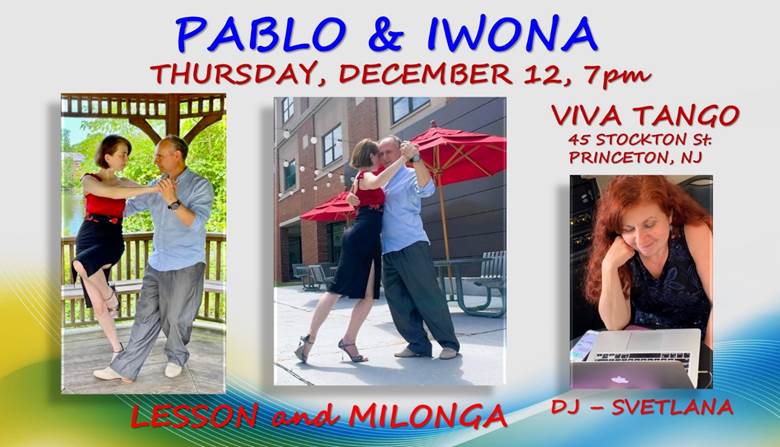 Thursday, December 12th. Pablo Garcia Gomez and Iwona Ionescu are the instructors for the Princeton Adult School, Tango classes. They are also very popular instructors at Viva Tango and other tango events. After the lesson Pablo and Iwona will be available at the side of the dance floor to help any dancers wishing more assistance with the lesson. DJ Svetlana Howells will play her best tandas for your dancing pleasure. Svetlana says “Tango is passionate, challenging, mood changing and completely addicting. It’s excellent for both your physical and mental state of being.