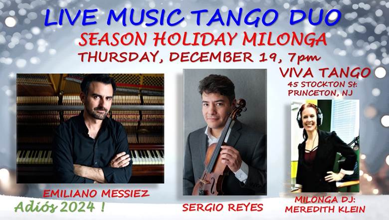 The VivaTango Holiday Party with live music is on Thursday December 19. This annual tradition draws back the whole VivaTango family. We are always happy to see dancers and instructors who have not been dancing recently join in. Expect to see and dance with man y friends at this party. Live music will be provided by Emiliano Messiez and Sergio Reyes.