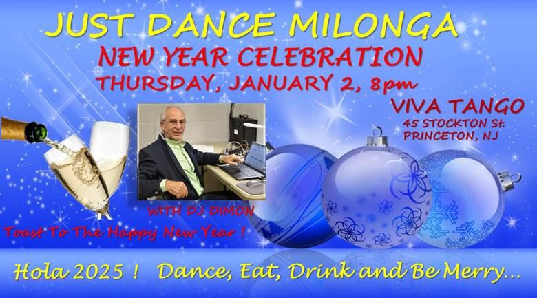 JUST DANCE, eat, drink and be merry with your friends at Viva Tango. We will have Holiday snacks and sparkling wine to toast the New 2025. And of course, DJ DimOn will play his festive tandas and cortinas all evening long. Come and celebrate the New Year 2025 with us. Note, we start at 8:00 pm, no lesson, performance, or live music – Just Dance!