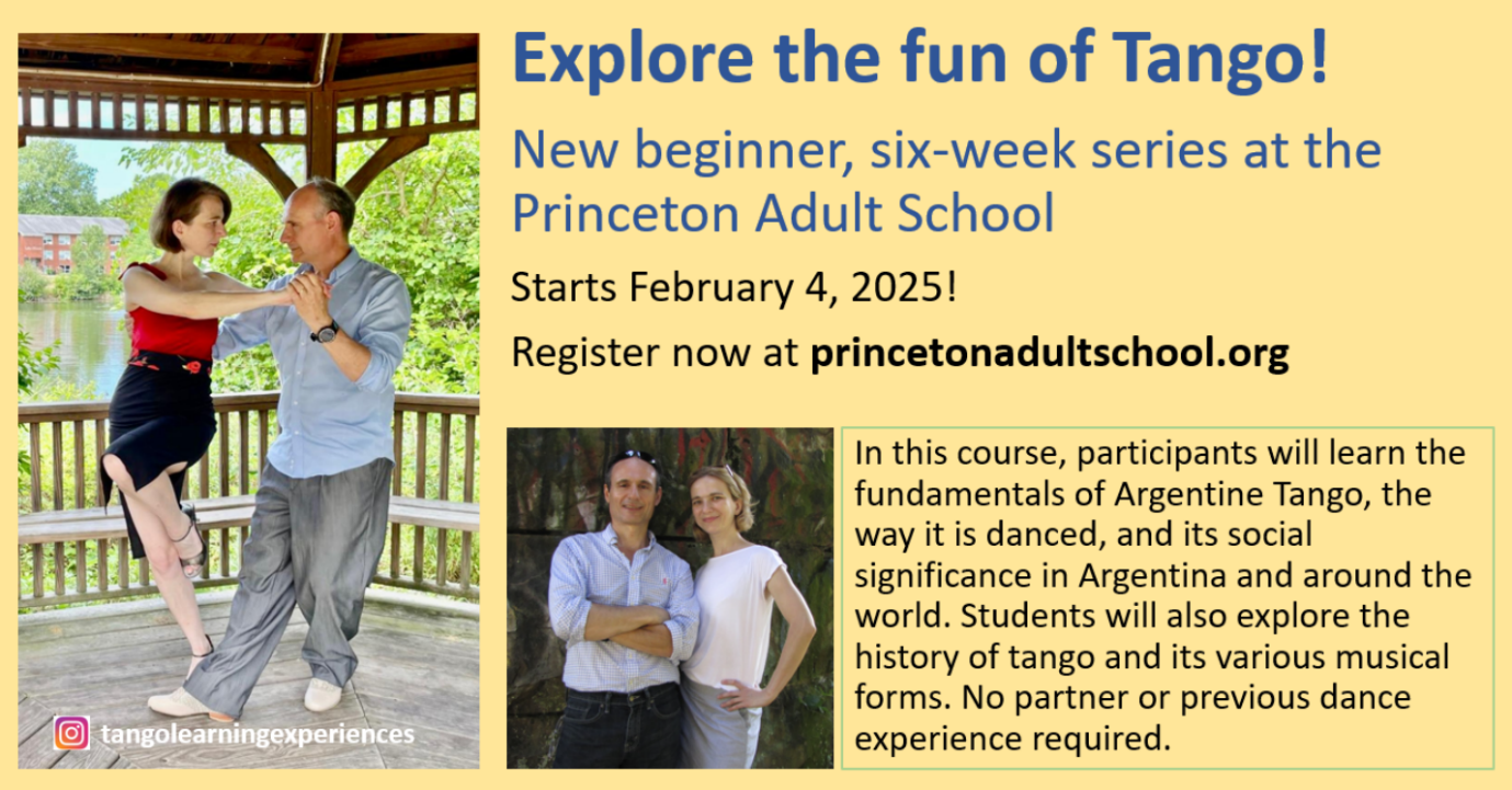 VivaTango is located at 45 Stockton Street, Princeton New Jersey. There is a well-lit, off-street parking lot at the venue. The large dance floor is in the smaller of the two buildings. The venue is easily accessed by rail from NYC and Philly. Just get a ticket to Princeton (not Princeton Junction. You get off the train at Princeton Junction and take the connecting shuttle train to Princeton.) The venue is 8 blocks from the Princeton Train Station with a lovely walk through the Princeton University Campus (0.8 mi.) MAP