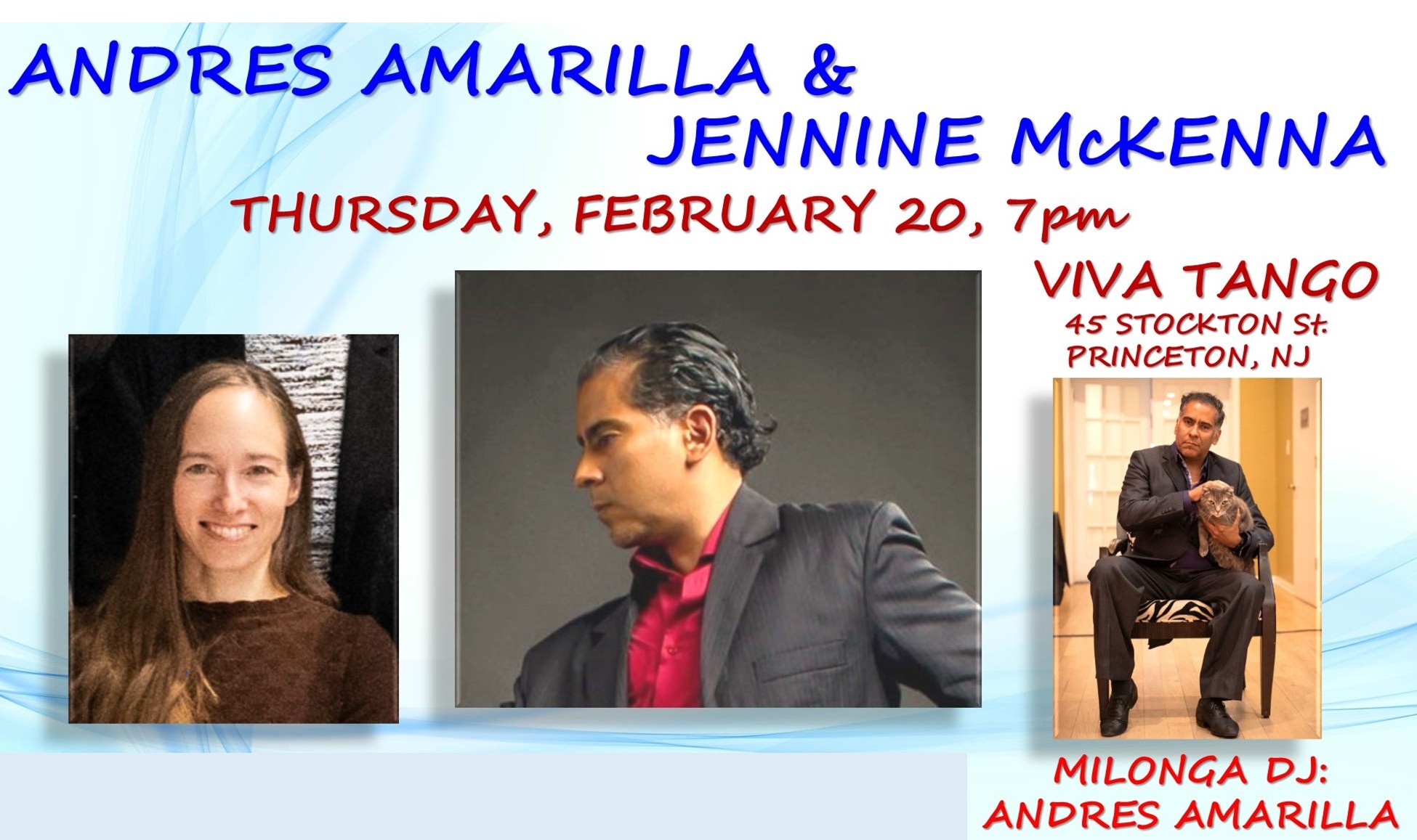 Thursday, February 20th. Andres Amarilla & Jennine McKenna will teach a lesson . Jennine has enthusiastically pursued dancing since discovering it as a child. Although she has studied a range of styles from ballet to blues, tango resonates most deeply with her. She loves its technically demanding, expressive, and improvisational nature. She is committed to sharing with others the joy she has found through dancing. Andres is well-known to Viva Tango community as a teacher, performer, and DJ. He will play his very best music for your dancing pleasure.