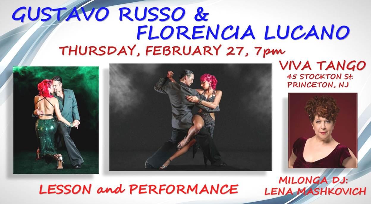 Thursday, February 27th. Gustavo Russo is an extraordinary dancer, choreographer for innovative concepts, creativity, and indisputable quality as an artist. He was a star of Tango Passion and Tango Seduction shows. In addition to his travelling shows, Gustavo and his talented partner Florencia Lucano travel the world giving master classes and performing at tango festivals. Lena Mashkovich is an experienced traditional tango DJ, who has been playing tango music for over 20 years. Her extensive knowledge of the genre and its history brings a unique flavor to any event.