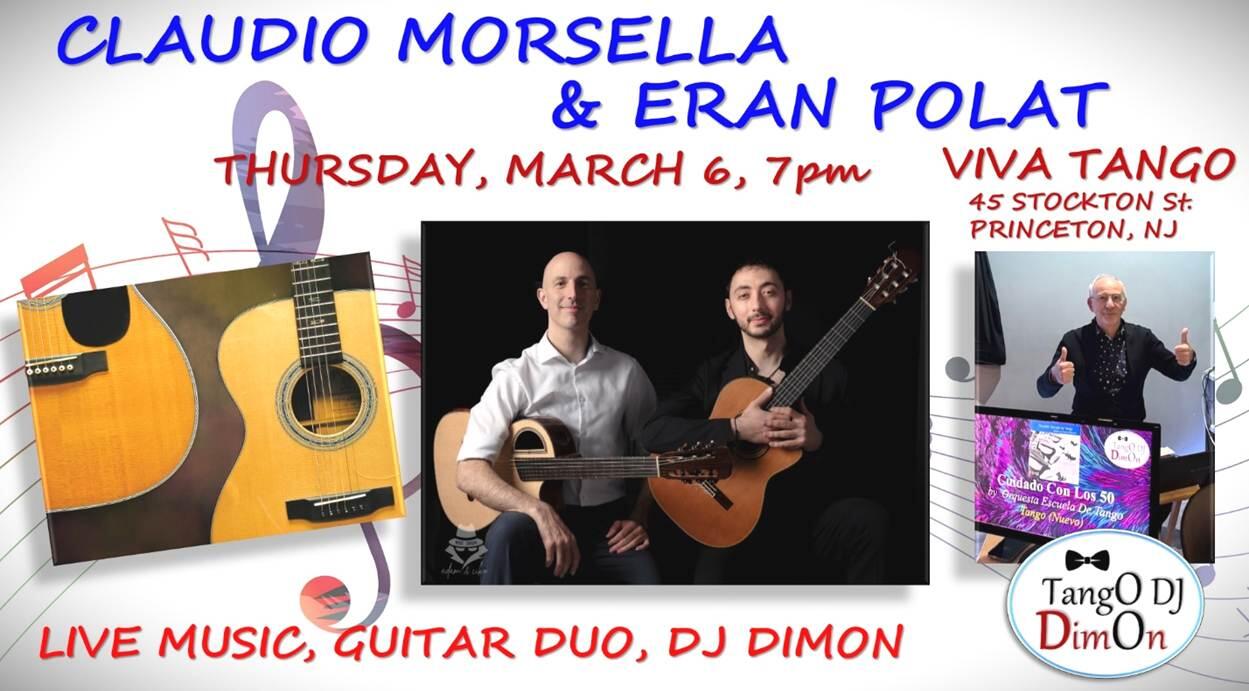 Thursday, March 6th. Claudio Morsella and Eran Polat have delighted Viva Tango dancers several times in the past. They return to perform for us by popular demand. Their mastery of guitar and mutual synergy create very danceable and exciting tango music for our enjoyment. Their expressions of familiar tango tunes are unique and sensual. DJ DimOn will play his very best tango selections and hopping cortinas before, between, and after the two live music sets.