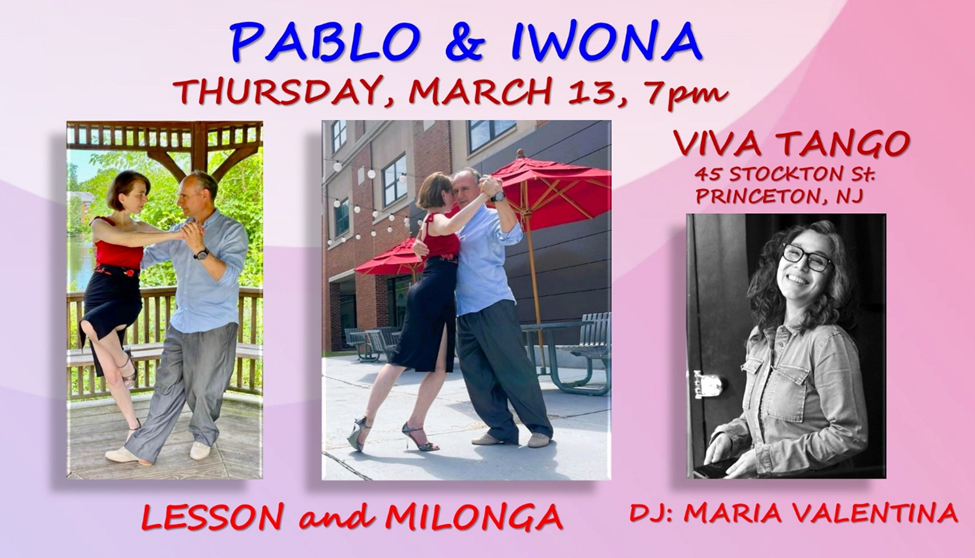 Thursday, March 13th. Pablo Garcia Gomez and Iwona Ionescu are the tango instructors for the Princeton Adult School Tango classes. They are also very popular instructors at Viva Tango and other tango events. Tonight they will teach an all-levels lesson. After the lesson Pablo and Iwona will be available at the side of the dance floor to help any dancers wishing more assistance with the lesson. DJ María Valentina’s creative and artful construction of tandas tell a story, weaving each tanda into a beautiful tapestry in which DJ and tangueros build a connection throughout the evening.