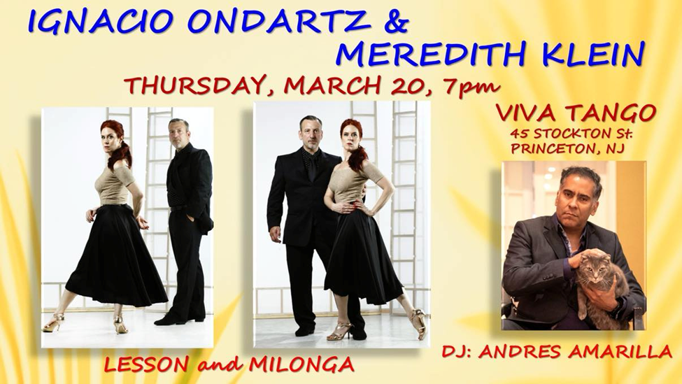 Thursday, March 20th. Ignacio Ondartz and Meredith Klein are frequent instructors and performers at Viva Tango. Meredith is the founder of Philadelphia Argentine Tango School (PATS). She is a popular instructor, performer and the organizer of the annual Philadelphia Tango Festival. Her partner Ignacio comes from a province of Buenos Aires. He began studying tango in 2000 with Julio Valdez and never stopped improving his dance and professional training, taking classes, seminars and workshops with renowned masters of the genre like Fabian Salas, Chicho Frumboli, Julio Balmaceda, among many others. Andres Amarilla will be the DJ this evening.