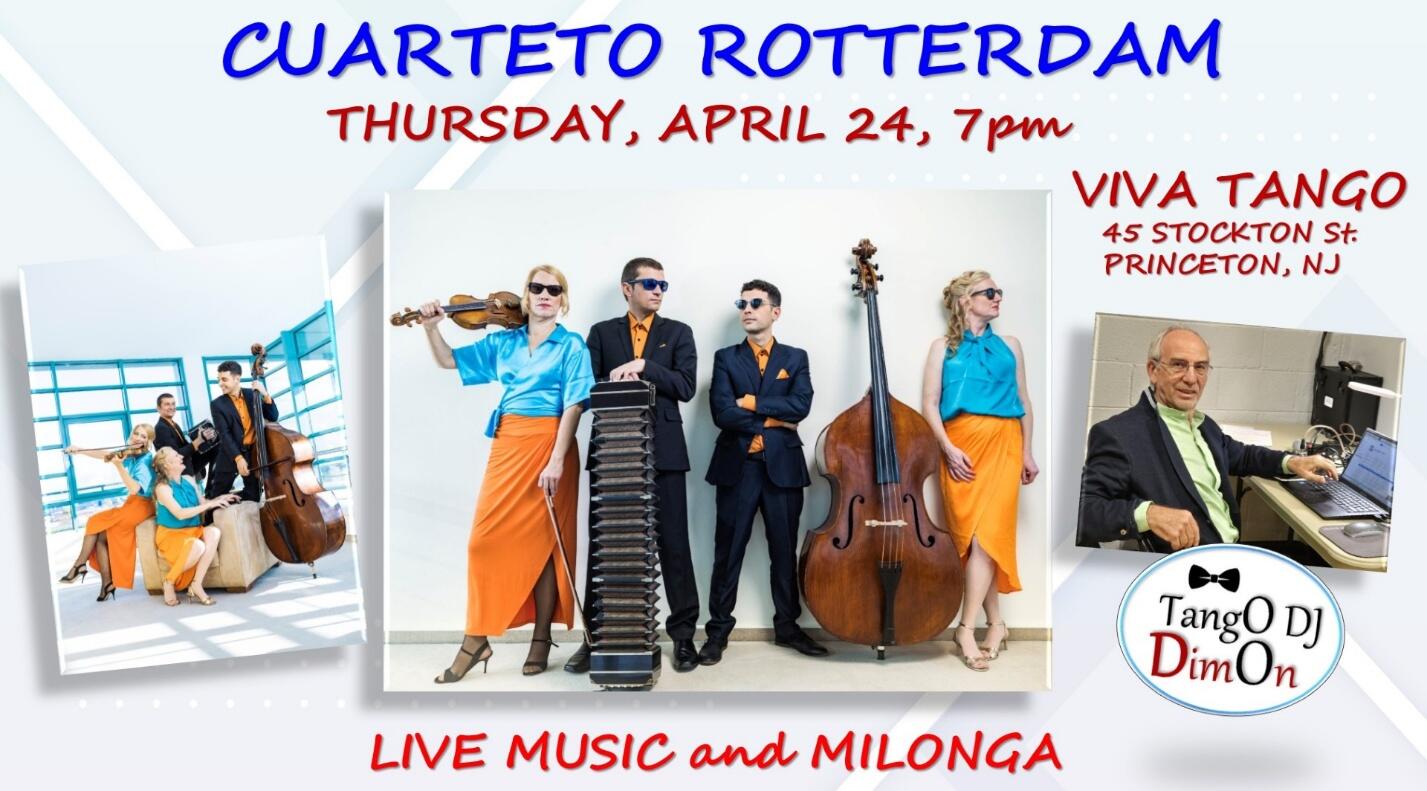 Thursday, April 24th. Cuarteto Rotterdam is one of the most successful European tango groups. They play a perfect mixture of old tango classics, Tango Nuevo, and contemporary Argentine and European tango music. Nowhere else will you hear such concert-like and refined music, which offers everything from melodic to joyous moods. With their creativity, imagination, and experience, this small orchestra conjures up a world of tango for all kinds of emotions. Don’t miss this rare opportunity to hear and dance to this band. DJ Dimon will play his tandas and keep you dancing between the live sets.