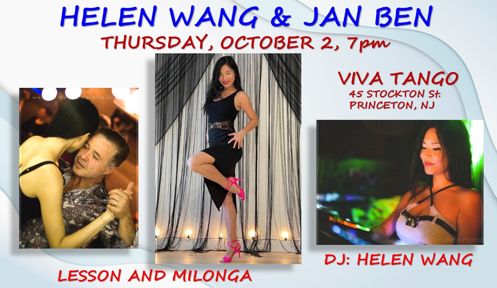 Thursday, October 2nd. Helen Wang & Jan Ben will teach a lesson and host the milonga. Helen is a very popular professional tango instructor and performer. Helen’s teaching brings together the music, passion, elegance, natural embrace, freedom of movement and expression of the dance. Her partner Jan Ben, is an accomplished tango dancer and will assist Helen with the lesson. Helen Wang is also an excellent DJ and will delight us with her music selections all evening, following the lesson.