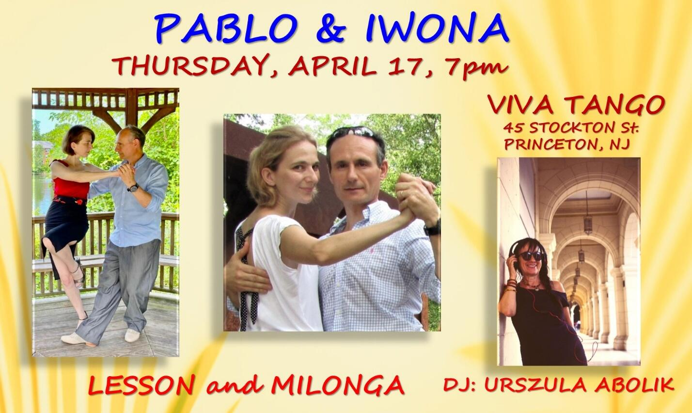 Thursday, April 17th. Pablo Garcia Gomez and Iwona Ionescu are the tango instructors for the Princeton Adult School Tango classes. They are also very popular instructors at Viva Tango and other tango events. Tonight, they will teach an all-levels lesson. After the lesson Pablo and Iwona will be available at the side of the dance floor to help any dancers wishing more assistance with the lesson. DJ Urszula will keep you dancing after the lesson, with her captivating music and sometimes surprising tandas.