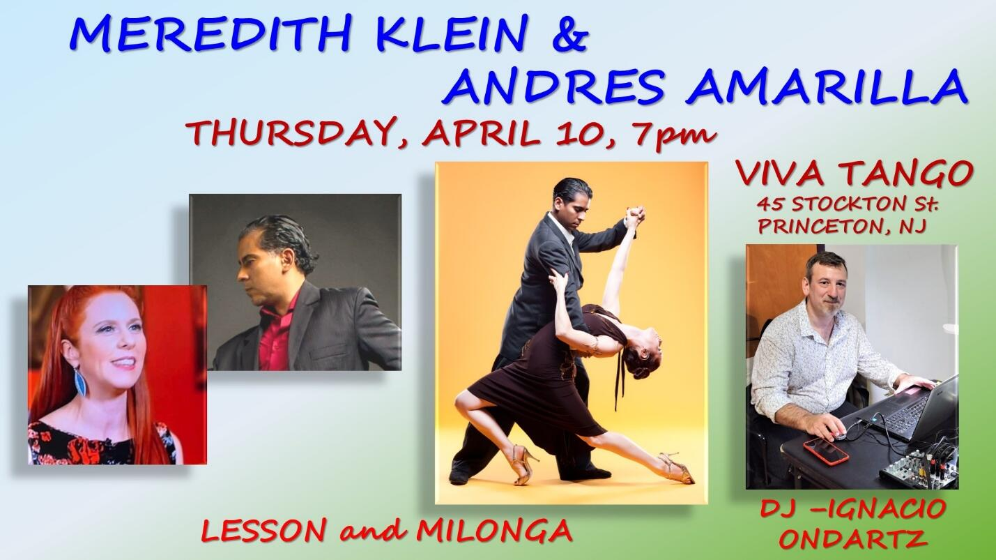 Thursday, April 10th. Meredith Klein and Andres Amarilla are frequent instructors and performers (together or individually) at Viva Tango. Meredith is the founder of Philadelphia Argentine Tango School (PATS). She is a popular instructor, performer and the organizer of the annual Philadelphia Tango Festival. Andres was born and raised in Buenos Aires. He studied with and performed in the dance companies of three of the greatest tangueros of all time: Gustavo Naveira, Juan Carlos Copes, and Rodolfo Dinzel. Ignacio will be the milonga DJ and play his very best music for you to dance to.