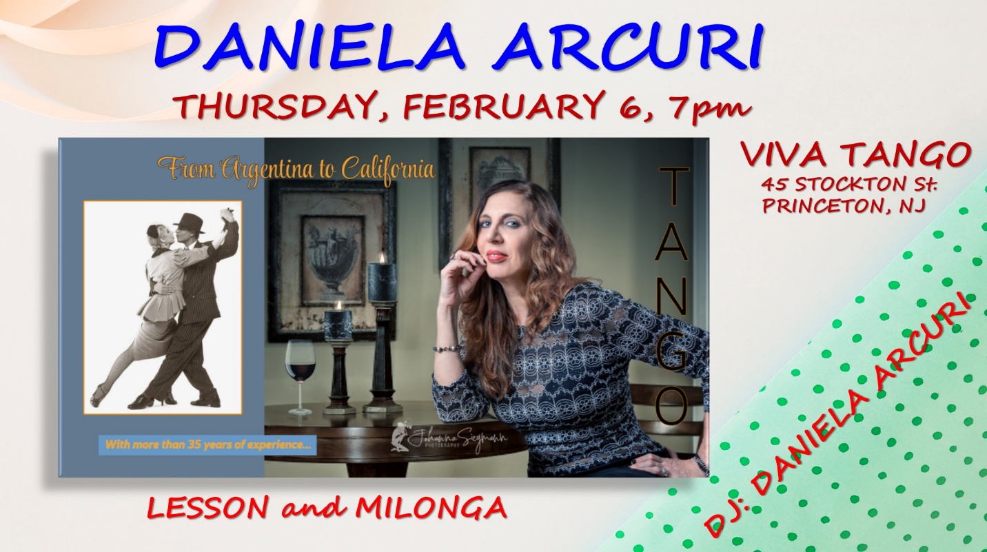 7:00 pm: Lesson with Daniela Arcuri.  8:15 pm: Milonga with DJ Daniela.