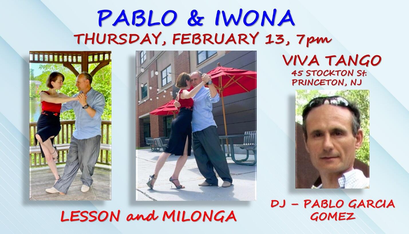 Thursday, February 13th. Pablo Garcia Gomez and Iwona Ionescu are the tango instructors for the Princeton Adult School Tango classes. They are also very popular instructors at Viva Tango and other tango events. Tonight they will teach an all-levels lesson. After the lesson Pablo and Iwona will be available at the side of the dance floor to help any dancers wishing more assistance with the lesson. In addition, Pablo Garcia Gomez will be the DJ. His unique taste and understanding of tango music are reflected in the selections of the tunes we will be dancing to this evening.
