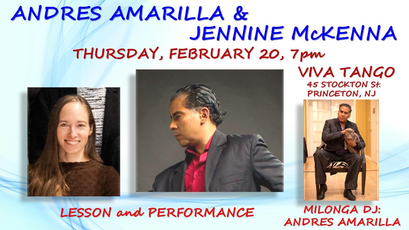Thursday, February 20th. Andres Amarilla & Jennine McKenna will teach a lesson . Jennine has enthusiastically pursued dancing since discovering it as a child. Although she has studied a range of styles from ballet to blues, tango resonates most deeply with her. She loves its technically demanding, expressive, and improvisational nature. She is committed to sharing with others the joy she has found through dancing. Andres is well-known to Viva Tango community as a teacher, performer, and DJ. He will play his very best music for your dancing pleasure.