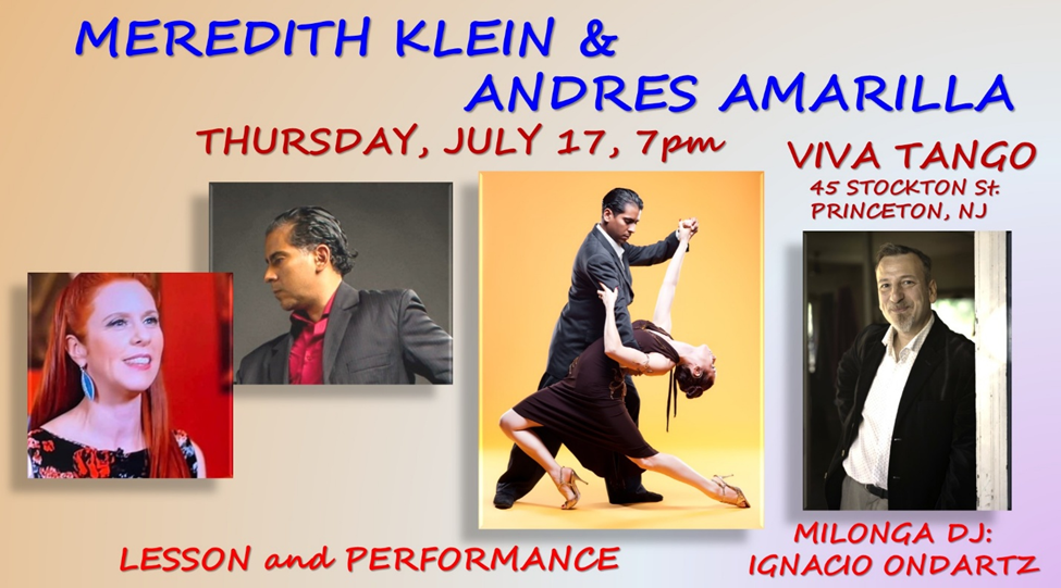 Thursday, July 17th.Meredith Klein and Andres Amarilla are frequent instructors and performers (together or individually) at Viva Tango. Meredith is the founder of Philadelphia Argentine Tango School (PATS). She is a popular instructor, performer and the organizer of the annual Philadelphia Tango Festival. Andres was born and raised in Buenos Aires. He studied with and performed in the dance companies of three of the greatest tangueros of all time: Gustavo Naveira, Juan Carlos Copes, and Rodolfo Dinzel.